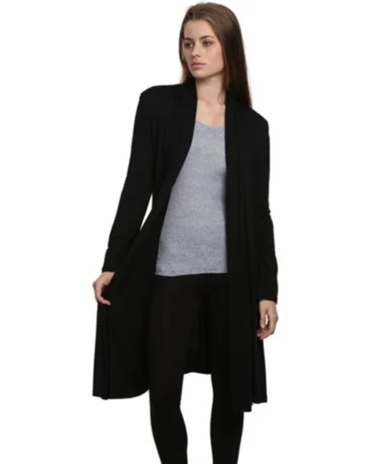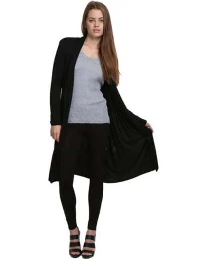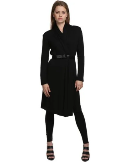 The black dress coat by Nucleus clothing is a versatile yet stylish and functional addition and become a Capsule wardrobe staple for winter. Wear this as a dress by using your best belt and wrapping it over and securing, or as a coat by leaving it open. Featuring a double neck shawl effect that drapes as you wear it and also functions as extra fabric to create the wrap. The long sleeves are fitted and the hem finishes below knee length. Wear with Denims or leggings and boots or your favourite sneakers as a coat.